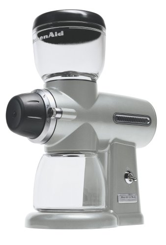 The KitchenAid Pro Line Coffee Mill is made of handsome Die-Cast metal housing making for a rugged, stable, and easy to clean unit. With the Pro Line Coffee Mill, you can adjust the Commercial Quality Stainless Steel Cutting Burrs to 15 different Grind Sizes for that perfect Espresso, French Press, or cup of automatic drip. The 7 oz capacity bean hopper and coffee bin are glass to minimize the static "cling" of coffee grounds. The DC motor with gear reduction system makes for quiet grinding. System turns the cutting burrs at just 450 rpm, minimizing the frictional heating of the grinds and preserving coffee flavor and aroma. The Under-Cabinet design allows the unit to fit easily under wall cabinets on the countertop. The smooth metal housing is a snap to wipe clean. Bean hopper, hopper lid, and coffee bin are dishwasher-safe.