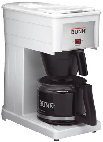 Bunn GRX-W 10-cup home pourover coffee brewer, white. The Bunn standard for home brewers that delivers fast, commercial style coffee brewing at home. Coffee that meets the exacting requirements of restaurants and speciality coffee shops worldwide is never more then 3 minutes away. Original hot water reservoir-style brewer. Convenient close-and-brew lid. Brews ten cups of perfect coffee in 3 minutes. Produces exceptional, cafe quality coffee. Stianless steel tank holds ready-to-brew hot water. Internal thermostat keeps water at ideal brewing temperature. Patented sprayhead design imrpoves coffee flavor extraction. Lighted On/Off switch shows warming plate has power. Porcelian-coated warming plate for easy clean-up. Vacation switch turns tank heat off. Decanter holds 50 ounces.