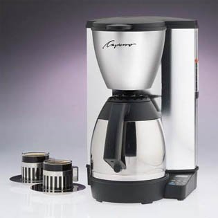This Capresso 10 Cup Electronic Coffee Maker has a unique alloy body and stainless steel thermal carafe. The new stainless steel lined heating system eliminates contact with aluminum dramatically reduces decalcifying and brews up to 50% more quietly than most other coffeemakers. . Brews 10 cups of coffee in under 8 minutes for maximum flavor and aroma. . Brews through the closed lid of the stainless steel vacuum carafe. . Drip stop allows you to pour a cup while brewing. . Brews up to 50% more quietly than most other coffeemakers. . Special setting maintains aroma when brewing only 3 to 5 cups.. The stainless steel thermal vacuum carafe keeps coffee hot up to 4 hours. . Has a convenient brew-through-closed-lid technology. . Drip-free pouring spout. . The coffeemaker features an easy-to-read external water level indicator. . Replaceable charcoal water filter that removes up to 83% of chlorine and other impurities. . Indicator light shows when to replace the filter.. 24 hour programmable digital clock/timer. . Safety auto shut-off after brewing. . Concealed cord storage. . Easy access soft touch controls with illuminated display.