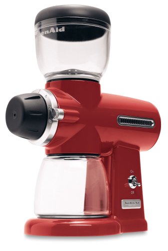 The KitchenAid Pro Line Coffee Mill is made of handsome Die-Cast metal housing making for a rugged, stable, and easy to clean unit. With the Pro Line Coffee Mill, you can adjust the Commercial Quality Stainless Steel Cutting Burrs to 15 different Grind Sizes for that perfect Espresso, French Press, or cup of automatic drip. The 7 oz capacity bean hopper and coffee bin are glass to minimize the static "cling" of coffee grounds. The DC motor with gear reduction system makes for quiet grinding. System turns the cutting burrs at just 450 rpm, minimizing the frictional heating of the grinds and preserving coffee flavor and aroma. The Under-Cabinet design allows the unit to fit easily under wall cabinets on the countertop. The smooth metal housing is a snap to wipe clean. Bean hopper, hopper lid, and coffee bin are dishwasher-safe.