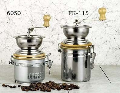 Classic style hand crank coffee grinder. Features steel grinding wheels and adjustable settings from fine to coarse grind. Stainless Steel with flip-top lid. 9" high.