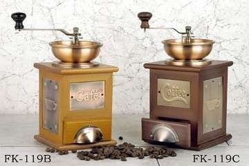 Classic style hand crank coffee grinder. Features steel grinding wheels and adjustable settings from fine to coarse grind. Cherry Wood with coffee logo. Wood is imported from Germany. and machined to the smoothest finish. 8 1/2" high