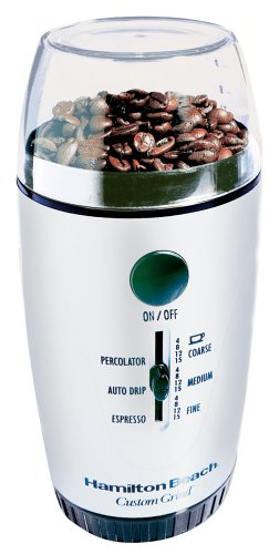 Hamilton Beach Custom Grinder eliminates the guessing on coffee grinding- with it's automatic preset coffee grind levels .Grinds up to 15-cups of beans , with one -touch operation. Has a convenient internal cord storage- platinum color.