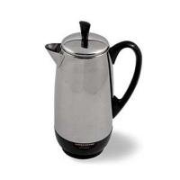 Housed in attractive, heavyweight stainless steel, this 1000-watt electric percolator brews from 4 to 12 cups of coffee with a super-fast, cup-a-minute brewing speed. The appliance circulates water continuously through the grounds during the brewing process, so by adjusting the brewing time, it's easy to control the coffee's strength. When brewing is complete, the unit automatically switches to a "keep warm" temperature to ensure each cup is as warm as the first. Other useful features include a stay-cool handle and cover knob, rolled edges for safe and easy handling, and a detachable cord, which provides the ability to easily serve fresh perked coffee right at the kitchen table without any hassle. The percolator measures approximately 13 by 9 by 8 inches and carries a one-year warranty.