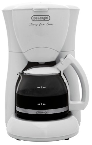 The DeLonghi DC50W Drip Coffee Maker is perfect for anyone who likes to start the day with a good, strong cup of coffee. Get the most flavor from your preferred blend and produce four cups of goodness, to get yourself ready to take on the day. Push-button control makes it easy to use Cord Storage Unit Size(WxDxH) - 7.09 x 9.06 x 11.3 Weight - 4.28 lbs.