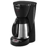 Combining advanced technology with an array of useful features, this 8-cup coffeemaker offers a 24-hour programmable digital clock/timer that allows for waking up to the aroma of freshly brewed coffee, or for having coffee ready to serve with dessert--without having to get up from the table half way through dinner. The unit's Perfect Pour thermal carafe keeps coffee hot and fresh for hours, plus provides a generous handle and a dripless spout for graceful pouring. Other highlights include a brew-pause function for pouring a cup before the end of the brewing cycle, a removable filter basket for easy filling and cleaning, a water-level indicator, an "on" indicator, and quick-clean touch-pad controls. The coffeemaker measures approximately 12 by 8-4/5 by 13-3/5 inches.