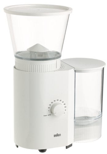 With 14 grind settings and a precision milling system, this electric coffee mill grinds coffee beans to any fineness without overheating them and spoiling their full flavor and aroma. Two ranges of grind settings are marked: one for fine grinds suitable for espresso and Turkish-style coffee, and the other for coarser grinds suitable for drip machines, French presses, and percolators. Selecting a grind requires only a twist of the ring under the coffee-bean container, which holds 8 ounces of beans and can be removed for cleaning. The ground-coffee container is permanently attached for convenience and has a rounded bottom to facilitate scooping. There's a timer dial calibrated by the number of cups desired, so the grinder uses only the amount of beans immediately needed. A measuring spoon (for 1 cup coffee) is included. The mill has cord storage underneath and carries a one-year warranty against defects. --Fred Brack