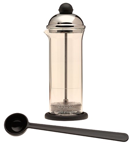 Turn nonfat milk into a wonderful foamy topping for your favorite coffee drink, adding richness without the fat. (Whole milk may be used, but nonfat really does give the best results.) Just add milk, pump, and serve. Don't be tempted to overfill--and be sure to pump gently to prevent the milk from spurting out. If you prefer hot froth, remove the plunger after pumping and pop the carafe into the microwave. A fat-free topping for fruit or dessert is just seconds away, embellished with sugar and/or vanilla if you like. The long-handled scoop lets you get every last spoonful, and the color-coordinated coaster provides a protective perch. All pieces of the set are top-rack dishwasher-safe, but hand washing is recommended. Before washing, unscrew the screen assembly from the frother rod so that you can wipe off the milky residue thoroughly. --Cynthia Nims