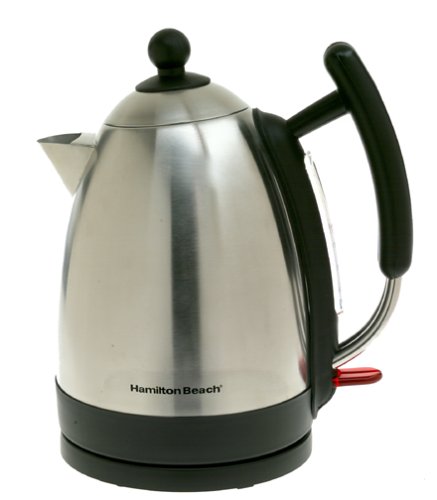This electric kettle heats up to 1.7 liters of water for coffee, tea, or instant soup without requiring the use of a stove. The round plastic base plugs into any standard outlet and gets water boiling in no time with its 1,500 watts of power. When water has boiled, a safety mechanism turns the unit off and prevents the kettle from boiling dry. For easy lifting and serving, the kettle rotates 360 degrees on the base and travels cord-free from counter to table for pouring. While the kettle's brushed stainless-steel exterior gets very hot during boiling, the plastic handle and knob on the removable lid safeguard against burns by staying cool. A drip-free spout keeps water from splashing and scalding and an anti-scale mesh filter traps lime and calcium particles (found in hard water) before they end up in a teacup. A clear water-level window conveniently shows how much water is left in the kettle. For long-term performance, the kettle's heating element is concealed, which keeps mineral deposits to a minimum and makes cleaning easier. Hamilton Beach warrants this product for two years from the date of purchase. --Cristina Vaamonde