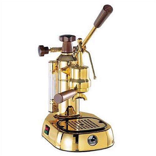 In addition to being a gorgeous accent piece to any kitchen counter or bar, this lever-model espresso machine produces up to eight 2-ounce cups of great-tasting espresso. The appliance features a 20-ounce solid-brass boiler--gold-plated and lacquer-coated--that delivers fast heat-up times and ensures durable performance, all while adding to the beautiful design. It also comes equipped with an internal thermostat, a steam-pressure piston, and handles made from beautiful rosewood. Even more, the unit's frothing system whips up creamy lattes and mochas; a separate spout and separate controls deliver exceptionally frothy cappuccinos. An instructional DVD comes included. Made in Italy, the 1000-watt ETL-listed espresso machine measures 16-1/4 by 4-1/2 by 12 inches and carries a one-year warranty.